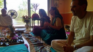 Prabhupāda: Somebody fanning, and water also. (chants maṅgalacaraṇa prayers) So śrī-caitanya-mano-‘bhiṣṭam. Śrī Caitanya Mahāprabhu’s ambition or mission. Śrī-caitanya-mahāprabhu mano ‘bhiṣṭaṁ sthāpitaṁ yena bhū-tale. His ambition was propagated or established by Śrīla Rūpa Gosvāmī, Sanātana Gosvāmī. They were ministers in charge of the then Pathan government in Bengal and very learned scholar in Urdu and Sanskrit, but after meeting Śrī Caitanya Mahāprabhu at Rāmakeli village in the district of Maldah in Bengal, North Bengal… That was supposed to be the capital of Nawab Hussain Shah. So then they joined to preach this saṅkīrtana movement or Kṛṣṇa consciousness movement. So their mission was to establish the Rādhā-Govinda Mandir, as many as possible. They first started in Vṛndāvana, Madana-mohana temple. Most Indians present here, they know. There are… [break] …temples in Vṛndāvana. There are five thousand temples in one small city of fifty thousand population, but the most important because they were established by the Gosvāmīs. Rūpa, Sanātana, Bhaṭṭa Raghunātha, Śrī Jīva, Gopāla Bhaṭṭa, Dāsa Raghunātha, the Six Gosvāmīs, direct disciple of Śrī Caitanya Mahāprabhu. The Sanātana Gosvāmī established first the Madana-mohana temple. Then Rūpa Gosvāmī established Govindajī’s temple. Then Jīva Gosvāmī established Rādhā-Dāmodara temple, then… [break] …Gosvāmī established Rādhā-Madana-mohana temple. Śyāmānanda Gosvāmī, he established Śyāmasundara temple. These are important temples.