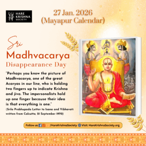 Prabhupada: Although according to material vision His Divine Grace Srila Bhaktisiddhanta Sarasvati Thakura Prabhupada passed away from this material world on the last day of December, 1936, I still consider His Divine Grace to be always present with me by his vani, his words. There are two ways of association–by vani and by vapu. Vani means words, and vapu means physical presence. PHYSICAL PRESENCE IS SOMETIMES APPRECIABLE AND SOMETIMES NOT, BUT VANI CONTINUES TO EXIST ETERNALLY. THEREFORE WE MUST TAKE ADVANTAGE OF THE VANI, NOT THE PHYSICAL PRESENCE. Bhagavad-gita, for example, is the vani of Lord Krsna. Although Krsna was personally present five thousand years ago and is no longer physically present from the materialistic point of view, Bhagavad-gita continues.