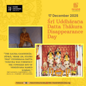 Vasudeva Prabhu departed on Srila Prabhupada’s disappearance day. Tuesday Oct. 24th (Iskcon Fiji observed on 24th,)Sunday ,22. Vasudeva Prabhu became very ill with very high fever. The nurses said, they didn’t think he was going to be around very long.On Tuesday, when his situation became evident, Bhagavati Mataji and their daughter Ajita put Tulsi leaf and Ganga JAL on the tongue.They were chanting and at that time devotees came. Their was kirtan and more chanting.Vasudeva Prabhu was fully awake.Bhagavati Mataji said, the moment he departed was very auspicious. She felt Prabhupada,’s presence. Every time Mataji went to the temple , she would pray to Prabhupada to take Vasudeva Prabhu back to Godhead.Vasudeva Prabhu lived with his two wives at the Suva Temple. Nandarani mataji was married to Vasudeva in 1946. Bhagavati Mataji was married in 1959..Nandarani departed almost two years ago. There will be an article in the Fiji Times next week about Vasudeva Prabhu.Hope to get a photo in a day or so.Bhagavati Mataji and Ajita will be travelling to Vrindavan in three weeks to place the ashes in the Yamuna.Your servant,Sri devi devi dasi