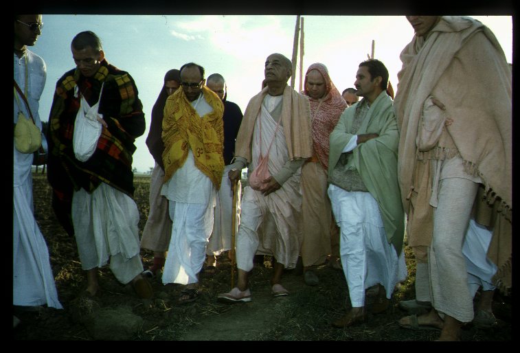 [Pointing to the rising sun with his cane] Here we see the sun just rising. But it is always there, in space. The Bhagavad-gita is like that: it is eternal truth. When the sun rises we don’t say, “Oh, the sun is just now coming into existence.” It is always there, but we can’t see it until it rises. Men used to think that at night the sun died and in the morning a new sun was created. They also used to believe the earth was flat. This is your scientific knowledge: every day a new opinion.