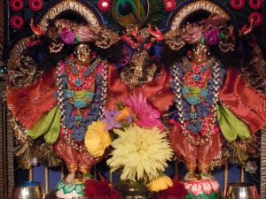 Adi 4.55–“The loving affairs of Śrī Rādhā and Kṛṣṇa are transcendental manifestations of the Lord’s internal pleasure-giving potency. Although Rādhā and Kṛṣṇa are one in Their identity, They separated Themselves eternally. Now these two transcendental identities have again united, in the form of Śrī Kṛṣṇa Caitanya. I bow down to Him, who has manifested Himself with the sentiment and complexion of Śrīmatī Rādhārāṇī although He is Kṛṣṇa Himself.”