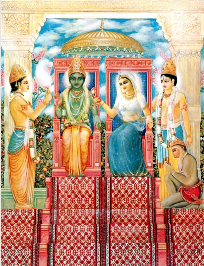 Being pleased by the full surrender and submission of Lord Bharata, Lord Rāmacandra then accepted the throne of the state. He cared for the citizens exactly like a father, and the citizens, being fully engaged in their occupational duties of varṇa and āśrama, accepted Him as their father.