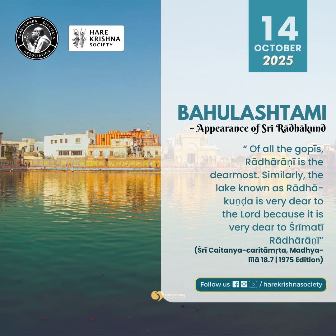 Srila Prabhupada: “Why is Rādhā-kuṇḍa so exalted? The lake is so exalted because it belongs to Śrīmatī Rādhārāṇī, who is the most beloved object of Śrī Kṛṣṇa. Among all the gopīs, She is the most beloved. Similarly, Her lake, Śrī Rādhā-kuṇḍa, is also described by great sages as the lake that is as dear to Kṛṣṇa as Rādhā Herself. Indeed, Kṛṣṇa’s love for Rādhā-kuṇḍa and Śrīmatī Rādhārāṇī is the same in all respects. Rādhā-kuṇḍa is very rarely attained, even by great personalities fully engaged in devotional service, not to speak of ordinary devotees who are only engaged in the practice of vaidhī bhakti.