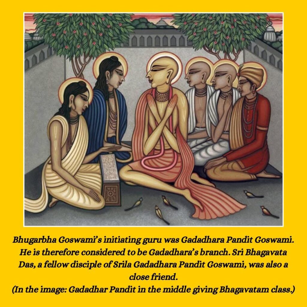 “The eleventh branch of Gadādhara Gosvāmī was Bhūgarbha Gosāñi, and the twelfth was Bhāgavata dāsa. Both of them went to Vṛndāvana and resided there for life.”