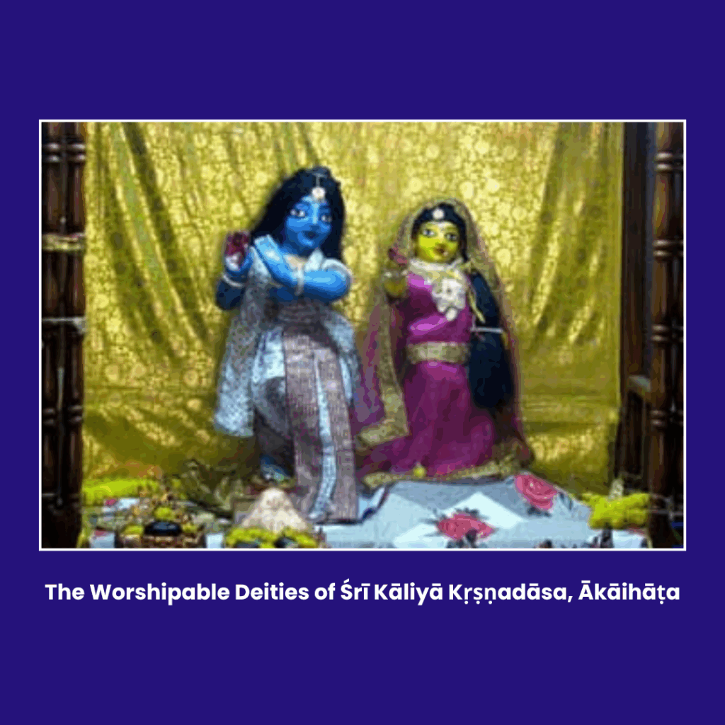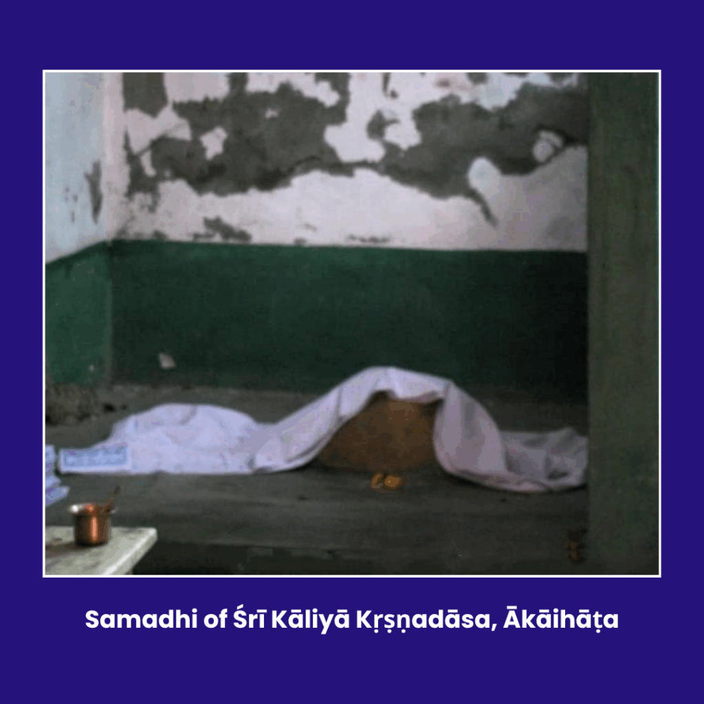 In the Caitanya-bhāgavata, Antya-khaṇḍa, Chapter Six, it is said that Kṛṣṇadāsa, who was known as Kāliyā Kṛṣṇadāsa, was formerly a gopāla (cowherd boy) of the name Labaṅga. He was one of the twelve cowherd boys. Kāliyā Kṛṣṇadāsa had his headquarters in a village named Ākāihāṭa, which is situated in the district of Burdwan within the jurisdiction of the post office and police station of Katwa. It is situated on the road to Navadvipa. To reach Ākāihāṭa, one has to go from the Vyāṇḍela junction station to the Katwa railway station and then go about two miles, or one has to get off at the Dāṅihāṭa station and from there go one mile. The village of Ākāihāṭa is very small. In the month of Caitra, on the day of Vāruṇi, there is a festival commemorating the disappearance day of Kālā Kṛṣṇadāsa.