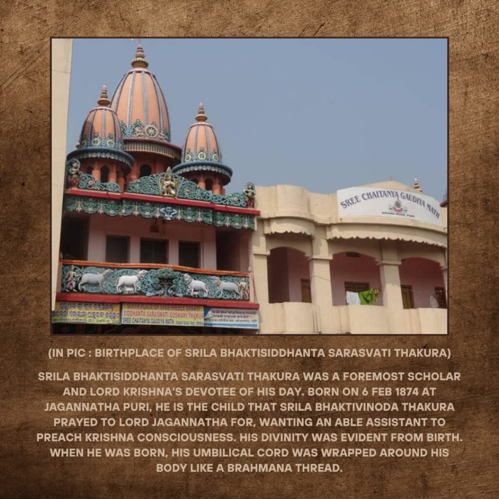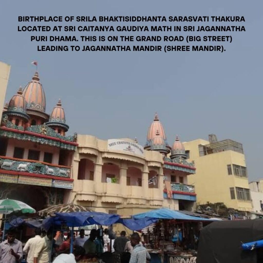 On February 6, 1874, in the sacred pilgrimage town of Jagannath Puri, where Srila Bhaktivinoda Thakura served as superintendent of the famous Jagannatha temple, Srila Bhaktisiddhanta appeared in this world. He was given the name Bimala Prasada. At the age of seven, Bimala Prasada had memorized the more than seven hundred Sanskrit verses of the Bhagavad-gita and could speak illuminating commentaries upon them. Srila Bhaktivinoda Thakura, the author of many important books and other writings on Gaudiya Vaisnava philosophy, trained his son in printing and proofreading.