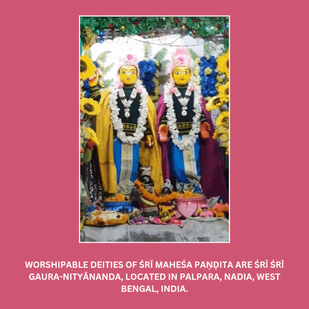 “The village of Maheśa Paṇḍita, which is known as Pālapāḍā, is situated in the district of Nadia within a forest about one mile south of the Cākadaha railway station. The Ganges flows nearby. It is said that formerly Maheśa Paṇḍita lived on the eastern side of Jirāṭ in the village known as Masipura or Yaśīpura, and when Masipura merged into the riverbed of the Ganges, the Deities there were brought to Pālapāḍā, which is situated in the midst of various villages such as Beleḍāṅgā, Berigrāma, Sukhasāgara, Cānduḍe and Manasāpotā. (There are about fourteen villages, and the entire neighborhood is known as Pāñcanagara Paragaṇā.) It is mentioned that Maheśa Paṇḍita joined the festival performed by Śrī Nityānanda Prabhu at Pāṇihāṭī. Narottama dāsa Ṭhākura also joined in the festival, and Maheśa Paṇḍita saw him on that occasion. In the temple of Maheśa Paṇḍita there are Deities of Gaura-Nityānanda, Śrī Gopīnātha, Śrī Madana-mohana and Rādhā-Govinda, as well as a śālagrāma-śilā.”