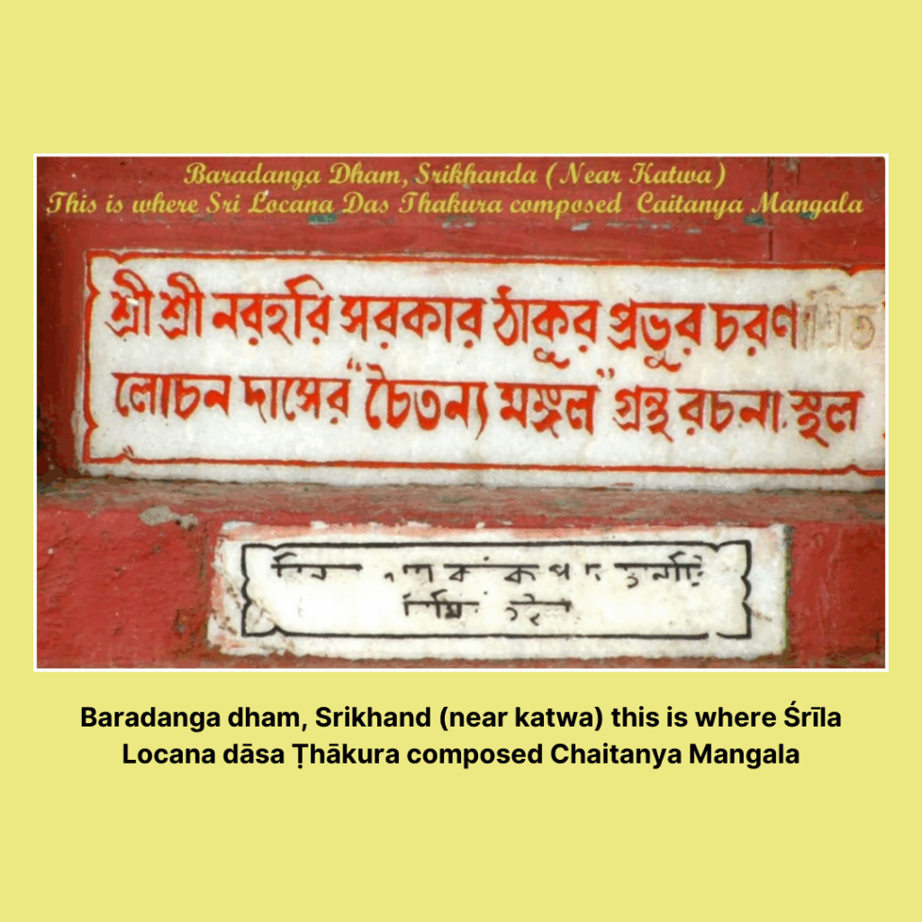“Narahari dāsa Sarakāra was a very famous devotee. Locana dāsa Ṭhākura, the celebrated author of Śrī Caitanya–maṅgala, was his disciple. In the Caitanya–maṅgala it is stated that Śrī Gadādhara dāsa and Narahari Sarakāra were extremely dear to Śrī Caitanya Mahāprabhu, but there is no specific statement regarding the inhabitants of the village of Śrīkhaṇḍa.”