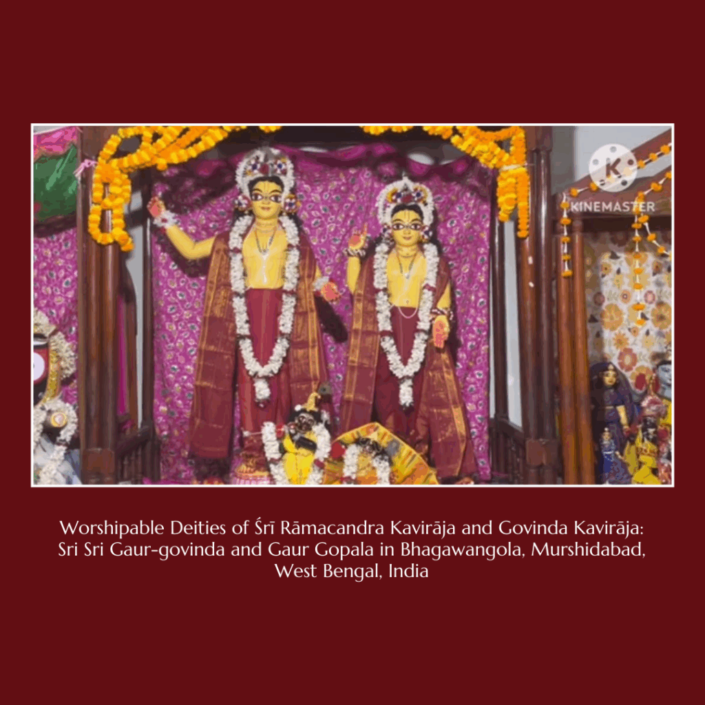 Śrī Rāmacandra Kavirāja, the son of Khaṇḍavāsi Cirañjīva and Sunanda, was a disciple of Śrīnivāsa Ācārya and the most intimate friend of Narottama dāsa Ṭhākura, who prayed several times for his association. His youngest brother was Govinda Kavirāja. Śrīla Jīva Gosvāmī very much appreciated Śrī Rāmacandra Kavirāja’s great devotion to Lord Kṛṣṇa and therefore gave him the title Kavirāja. Śrī Rāmacandra Kavirāja, who was perpetually disinterested in family life, greatly assisted in the preaching work of Śrīnivāsa Ācārya and Narottama dāsa Ṭhākura. He resided at first in Śrīkhaṇḍa but later in the village of Kumāra-nagara on the bank of the Ganges. Govinda Kavirāja was the brother of Rāmacandra Kavirāja and youngest son of Cirañjīva of Śrīkhaṇḍa. Although at first a sākta, or worshiper of goddess Durgā, he was later initiated by Śrīnivāsa Ācārya Prabhu. Govinda Kavirāja also resided first in Śrīkhaṇḍa and then in Kumāra-nagara, but later he moved to the village known as Teliyā Budhari on the southern bank of the River Padma. Since Govinda Kavirāja, the author of two books, Saṅgīta-mādhava and Gītāmṛta, was a great Vaiṣṇava kavi, or poet, Śrīla Jīva Gosvāmī gave him the title Kavirāja. He is described in the Bhakti-ratnākara, Ninth Taraṅga.