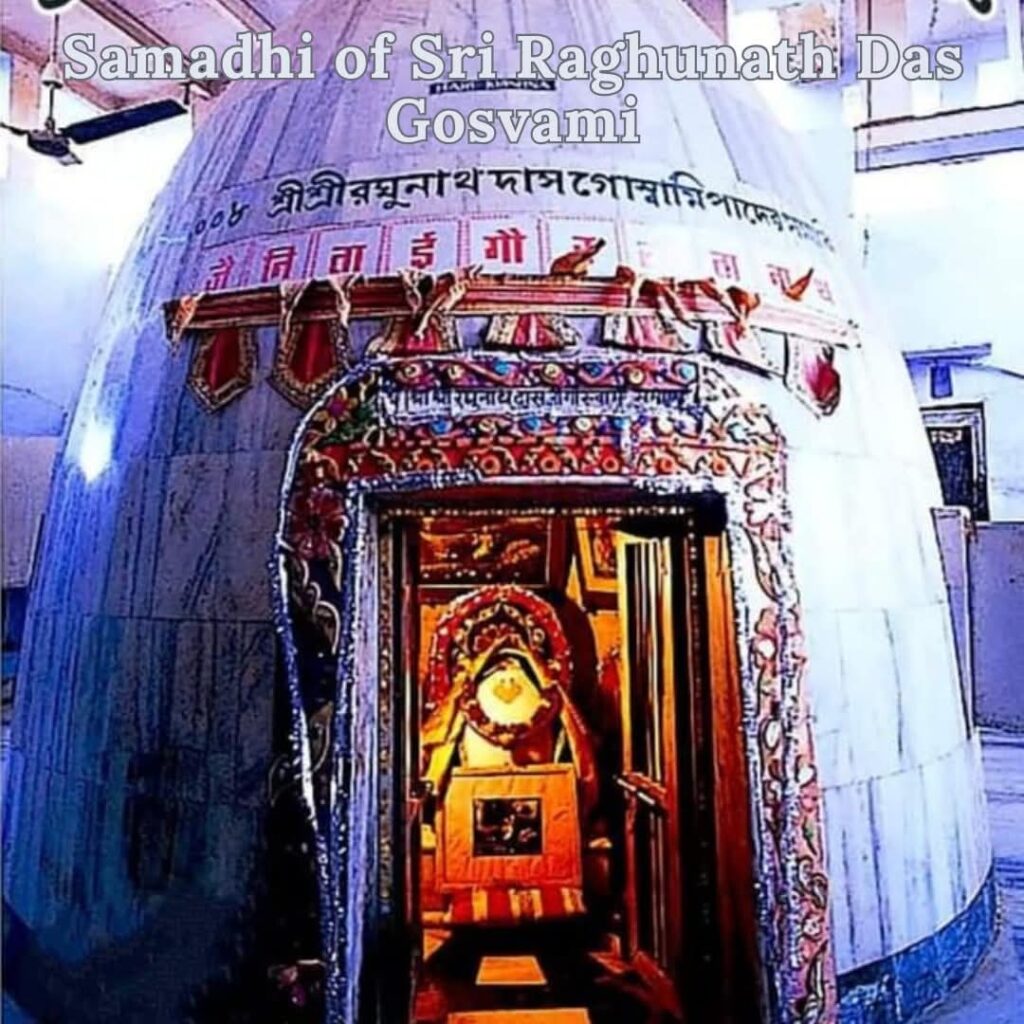Raghunātha dāsa Gosvāmī compiled three books: Stava-mālā (Stavāvalī), Dāna-carita, and Muktācarita. He was known as the prayojana-ācārya, one who teaches life’s ultimate goal by example. According to Gaura-gaṇoddeśa-dīpikā (186), he was formerly the gopī Rasa-mañjarī (sometimes said to be Rati-mañjarī). His samadhi stands on the bank of Rādhā-kuṇḍa, Vrindavan.”