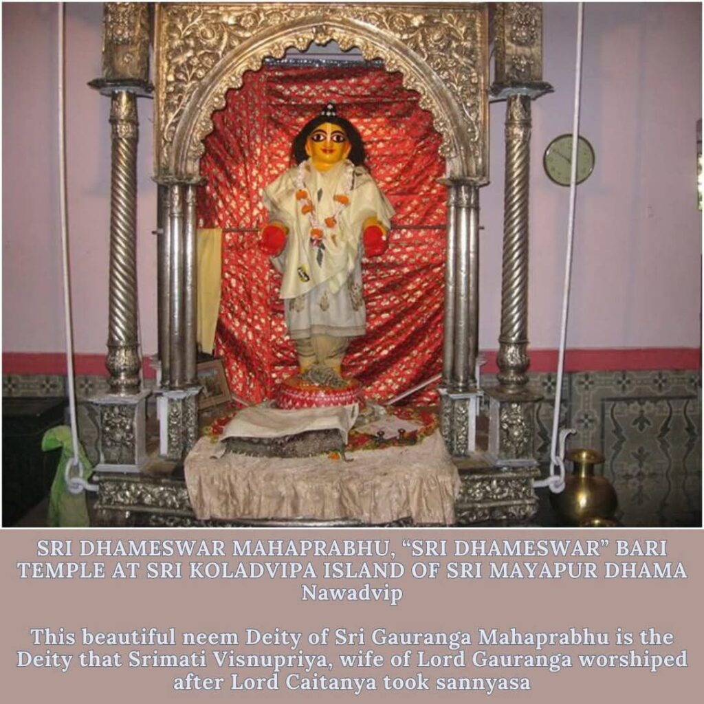 On all of Krishna’s visits to the material world, He is accompanied by His internal pleasure potency, personified as Lakshmidevi or Srimati Radharani. As Krishna expands into innumerable avatars, Srimati Radharani also expands to accompany Him. Srimati Vishnupriya Devi is one such expansion and was the second wife of Chaitanya Mahaprabhu.