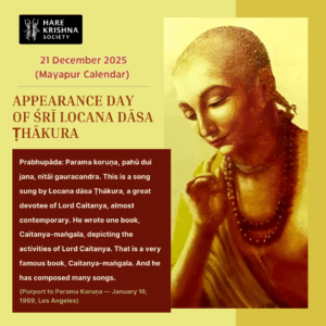 So similarly, Krsna also becomes very… Krsna and Kapiladeva, no difference. So Krsna also becomes very beautiful. He’s already beautiful. But when a devotee serves Him, a devotee comes to Him, He also becomes very beautiful. A devotee, when with his heart and soul, serves Krsna in dressing Him, in feeding Him, in giving Him flower, He becomes smiling. And if you can get Krsna, once smiling upon you, your life is fulfilled. Thank you very much. (end)